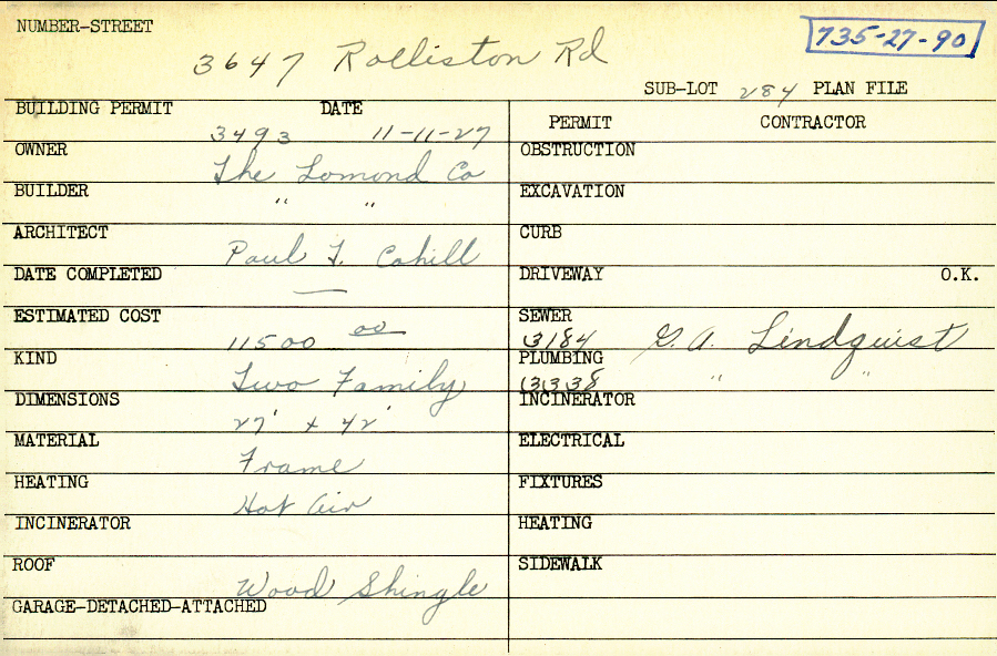 3647 Rolliston Road Shaker Heights, OH 44120 PARCEL ID: 735-27-090 Building Permit Date: 11-11-1927 Plan File Number: 1833 all scanned Microfilm Roll: Roll027 Neighborhood: Lomond Owner: The Lomond Company Builder: The Lomond Company Architect: Cahill, Paul T. Estimated Cost: 11500 Kind: Duplex or Two-Family Material: Frame Heating: Hot Air Roof: Wood Shingle |