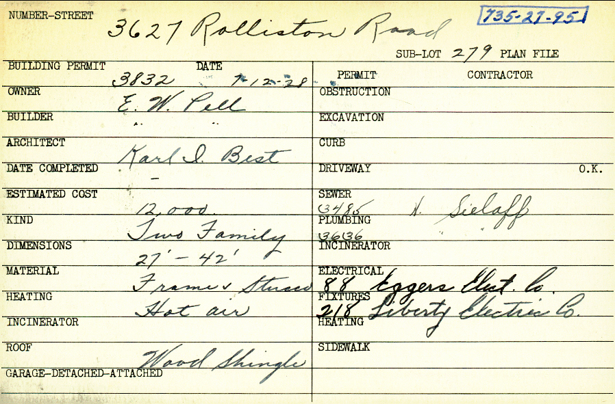 3627 Rolliston Road Shaker Heights, OH 44120 PARCEL ID: 735-27-095 Building Permit Date: 07-12-1928 Plan File Number: 0 Neighborhood: Lomond Owner: Pell, E. W. Builder: Pell, E. W. Architect: Best, Karl J. Estimated Cost: 12000 Kind: Duplex or Two-Family Material: Frame and Stucco Heating: Hot Air Roof: Wood Shingle |