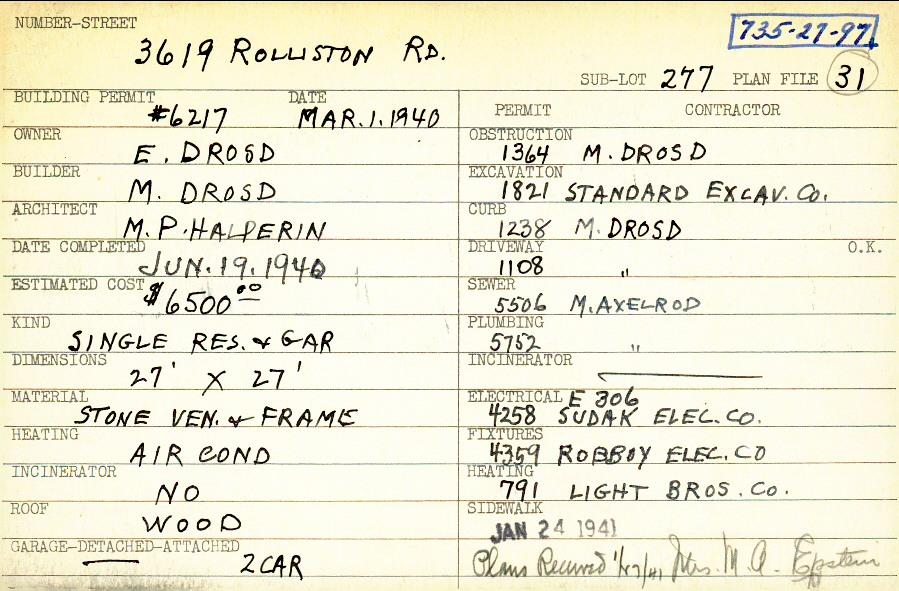 3619 Rolliston Road Shaker Heights, OH 44120 PARCEL ID: 735-27-097 Building Permit Date: 03-01-1940 Plan File Number: 31 Neighborhood: Lomond Owner: Drosd, E. Builder: Drosd, E. Architect: Halperin, M. P. Estimated Cost: 6500 Date Completed: 06-19-1940 Kind: Single Dwelling and Garage Material: Stone Veneer and Frame Heating: Air Conditioned Roof: Wood Garage: detached 2 car |