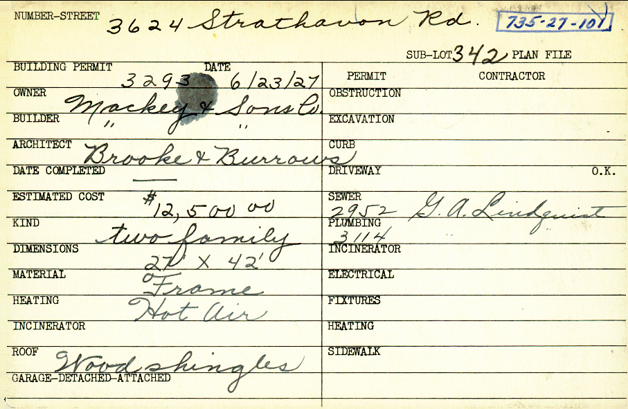 3624 Strathavon Road Shaker Heights, OH 44120 PARCEL ID: 735-27-101 Building Permit Date: 06-23-1927 Plan File Number: 0 Neighborhood: Lomond Owner: Mackey and Sons Company Builder: Mackey and Sons Company Architect: Brooke and Burrows Estimated Cost: 12500 Kind: Duplex or Two-Family Material: Frame Heating: Hot Air Roof: Wood Shingle |
