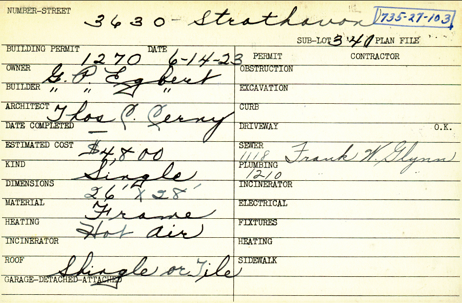 3630 Strathavon Road Shaker Heights, OH 44120 PARCEL ID: 735-27-103 Building Permit Date: 06-14-1923 Plan File Number: 0 Neighborhood: Lomond Owner: Egbert, G. P. Builder: Egbert. G. P. Architect: Cerny, Thomas C. Estimated Cost: 4800 Kind: Single, Single Residence or Dwelling Material: Frame Heating: Hot Air Roof: Shingles Card Available: yes |