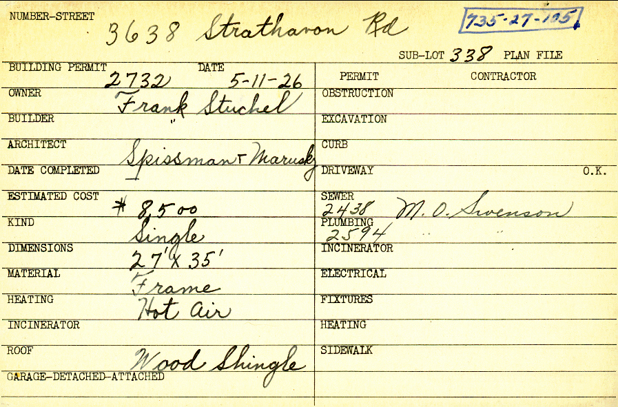 3638 Strathavon Road Shaker Heights, OH 44120 PARCEL ID: 735-27-105 Building Permit Date: 05-11-1926 Plan File Number: 0 Neighborhood: Lomond Owner: Stuchel, Frank Builder: Stuchel, Frank Architect: Spissman and Marusky Estimated Cost: 8500 Kind: Single, Single Residence or Dwelling Material: Frame Heating: Hot Air Roof: Wood Shingle Card Available: yes |