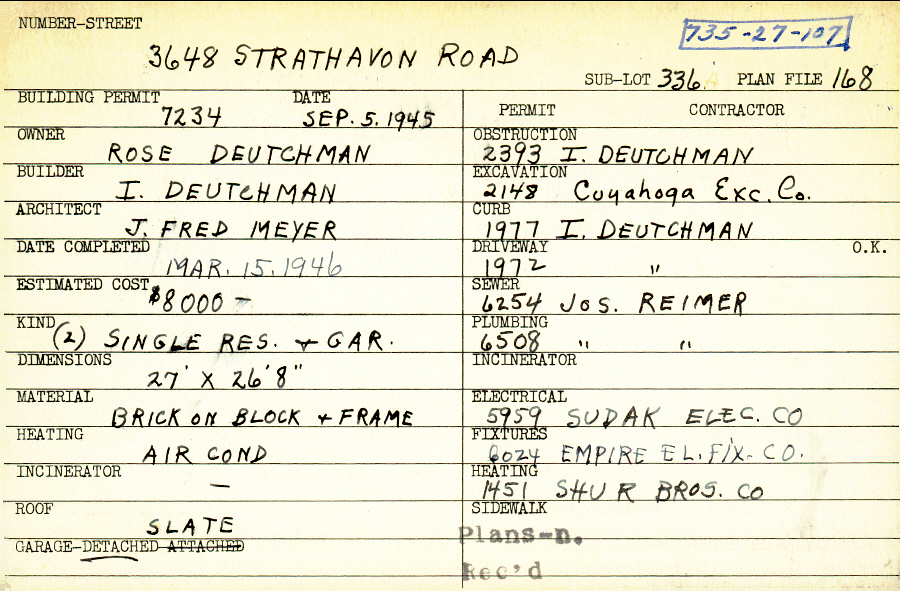 3648 Strathavon Road Shaker Heights, OH 44120 PARCEL ID: 735-27-107 Building Permit Date: 09-05-1945 Plan File Number: 168 all scanned Microfilm Roll: Roll002 Neighborhood: Lomond Owner: Deutchman, Rose Builder: Deutchman, I. Architect: Meyer, J. Fred Estimated Cost: 8000 Date Completed: 03-15-1946 Kind: Single Dwelling and Garage (2) Material: Brick on Block and Frame Heating: Air Conditioned Roof: Slate Garage: detached |