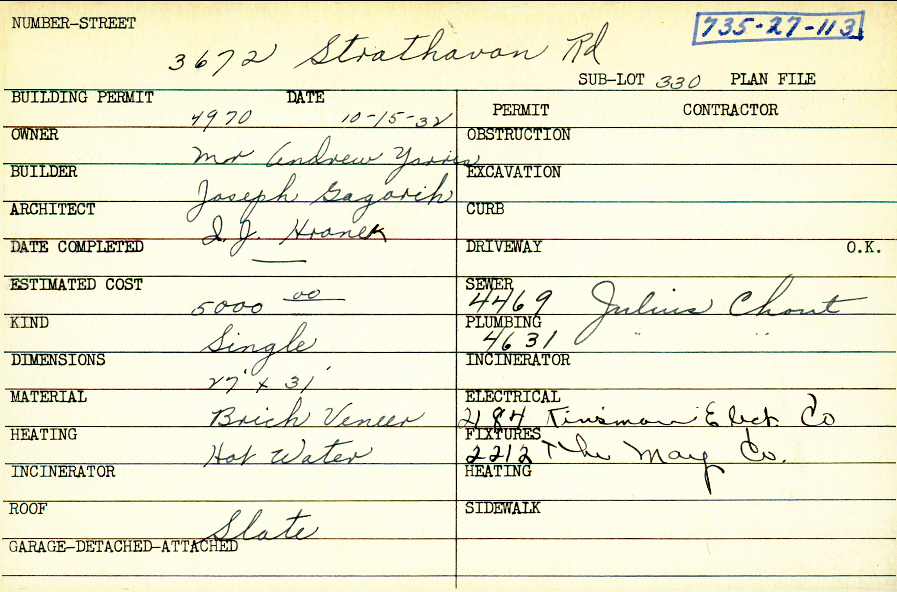 3672 Strathavon Road Shaker Heights, OH 44120 PARCEL ID: 735-27-113 Building Permit Date: 10-15-1932 Plan File Number: 0 Neighborhood: Lomond Owner: Yannis, Andrew Builder: Gagorik, Joseph Architect: Hronek, J. J. Estimated Cost: 5000 Kind: Single, Single Residence or Dwelling Material: Brick Veneer Heating: Hot Water Roof: Slate |