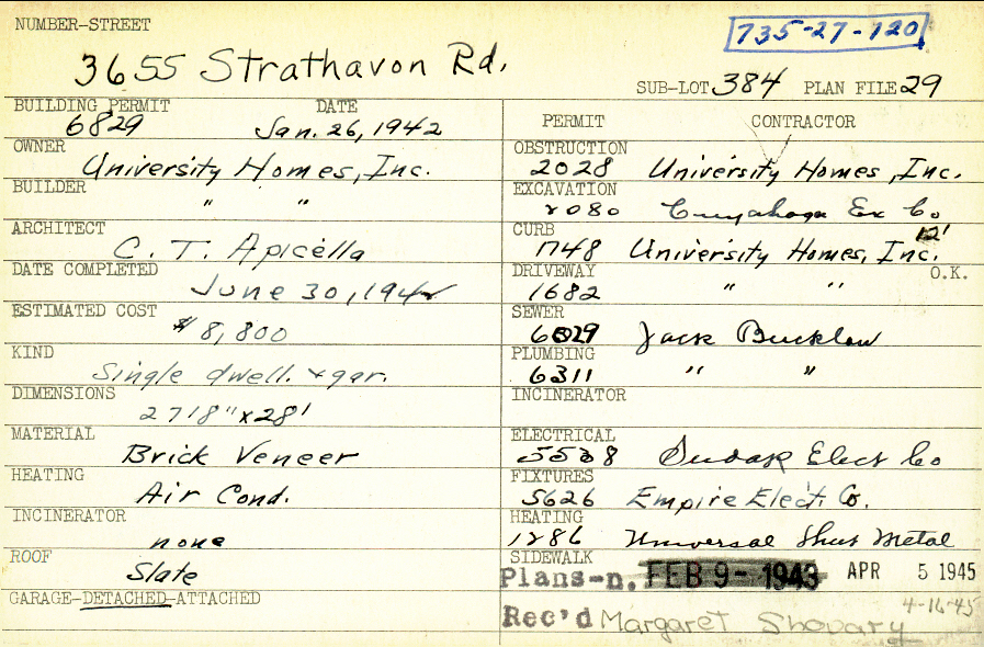3655 Strathavon Road Shaker Heights, OH 44120 PARCEL ID: 735-27-120 Building Permit Date: 01-26-1942 Plan File Number: 29 Neighborhood: Lomond Owner: University Homes Inc. Builder: University Homes Inc. Architect: Apicella, C. T. Estimated Cost: 8800 Date Completed: 06-30-1942 Kind: Single Dwelling and Garage Material: Brick Veneer Heating: Air Conditioned Roof: Slate Garage: detached Card Available: yes |