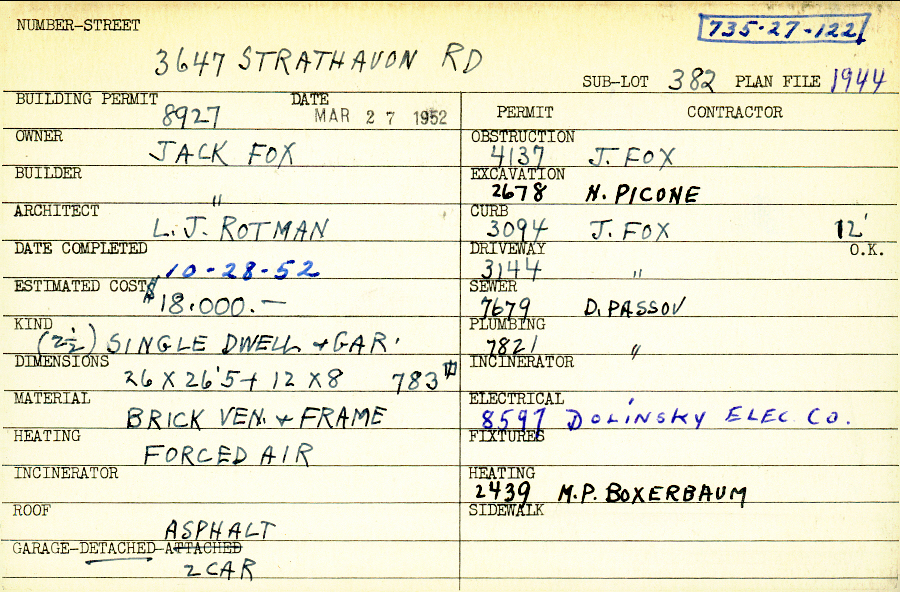 3647 Strathavon Road Shaker Heights, OH 44120 PARCEL ID: 735-27-122 Building Permit Date: 03-27-1952 Plan File Number: 1944 Microfilm Roll: Roll#29 Neighborhood: Lomond Owner: Fox, Jack Builder: Fox, Jack Architect: Rotman, L. J. Estimated Cost: 18000 Date Completed: 10-28-1952 Kind: Single 2-1/2 Material: Brick Veneer and Frame Heating: Forced Air Roof: Asphalt Garage: detached 2 car |
