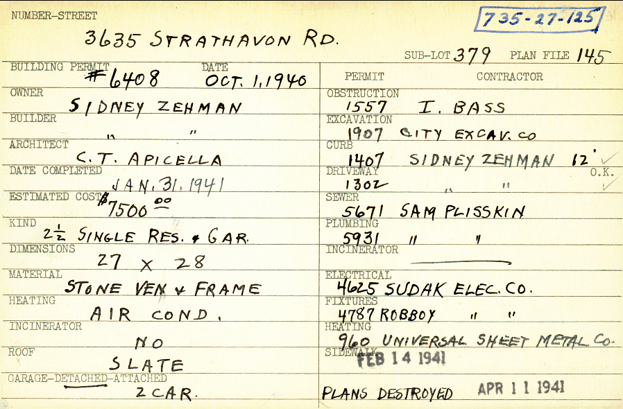 3635 Strathavon Road Shaker Heights, OH 44120 PARCEL ID: 735-27-125 Building Permit Date: 10-01-1940 Plan File Number: 145 Neighborhood: Lomond Owner: Zehman, Sidney Builder: Zehman, Sidney Architect: Apicella, C. T. Estimated Cost: 7500 Date Completed: 01-31-1941 Kind: Single 2-1/2 Material: Stone Veneer and Frame Heating: Air Conditioned Roof: Slate Garage: detached 2 car Card Available: yes |