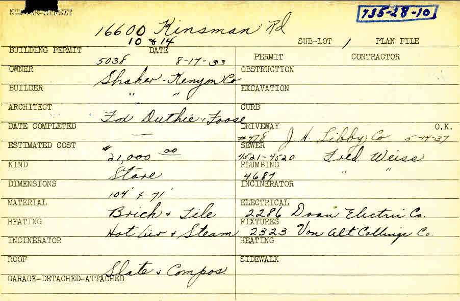16600 Chagrin Boulevard Shaker Heights, OH 44120 PARCEL ID: 735-28-010 Building Permit Date: 08-17-1933 Plan File Number: 4025, 7649, 7650, 8212, 11754, 11873-11881, 11883-11884, 11804* Microfilm Roll: Roll#59, Roll#94, Roll#97, NewRoll#9 Neighborhood: Moreland Owner: Shaker - Kenyon Company Builder: Shaker - Kenyon Company Architect: Fox, Duthie and Foose Estimated Cost: 21000 Kind: Commercial - Retail or Office Material: Brick and Tile Heating: Hot Air Roof: Slate, tar & gravel |