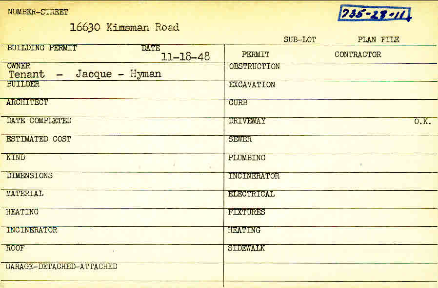 16630 Chagrin Boulevard Shaker Heights, OH 44120 PARCEL ID: 735-28-011 Building Permit Date: 11-18-1948 Plan File Number: 7300, 9613, 90-103, 12251, 93-24* Microfilm Roll: Roll#92, Roll#103, NewRoll#1, NewRoll#12, NewRoll#16 Neighborhood: Moreland Owner: Tenant-Jacque-Hyman |
