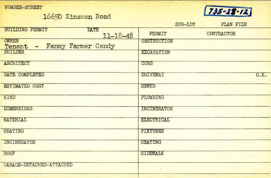 16650 Chagrin Boulevard Shaker Heights, OH 44120 PARCEL ID: 735-28-012 Building Permit Date: 11-18-1948 Plan File Number: 284 scanned, 7877, 9095, 9926 Microfilm Roll: Roll003, Roll#95, Roll#100, Roll#105 Neighborhood: Moreland Owner: Tenant-Fanny Farmer Candy |