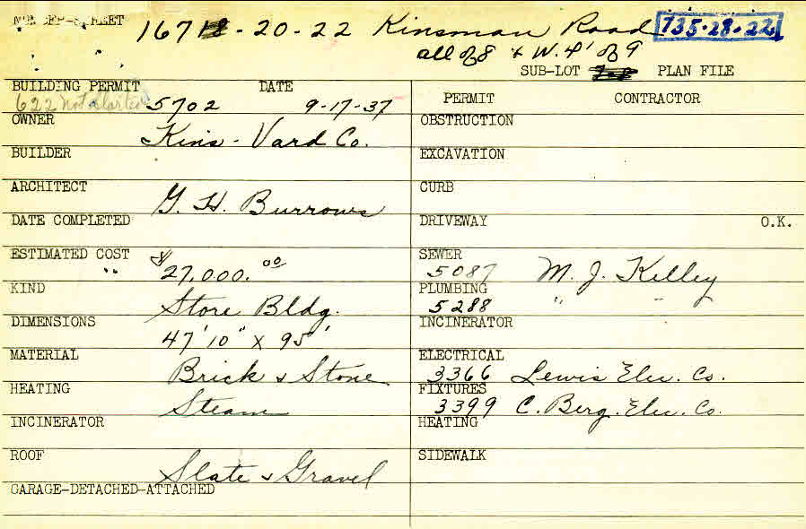 16718 Chagrin Boulevard Shaker Heights, OH 44120 PARCEL ID: 735-28-022 Building Permit Date: 09-17-1937 Plan File Number: 6424, 12784 Microfilm Roll: Roll#85, NewRoll#15 Neighborhood: Moreland Owner: Kins-Vard Company Architect: Burrows, G. H. Estimated Cost: 27000 Kind: Commercial - Retail or Office Material: Brick and Stone Heating: Steam Roof: Slate, tar & gravel |