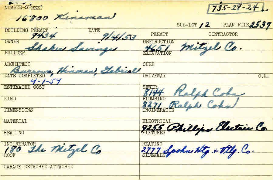 16800 Chagrin Boulevard Shaker Heights, OH 44120 PARCEL ID: 735-28-024 Building Permit Date: 09-04-1953 Plan File Number: 2537, 4364 scanned, 5180, 6583, 11603 Microfilm Roll: Roll #36, Roll062, Roll#70, Roll#86, NewRoll#8 Neighborhood: Lomond Owner: Shaker Savings Architect: Burrows, Hinman, Gabriel Date Completed: 04-01-1954 |
