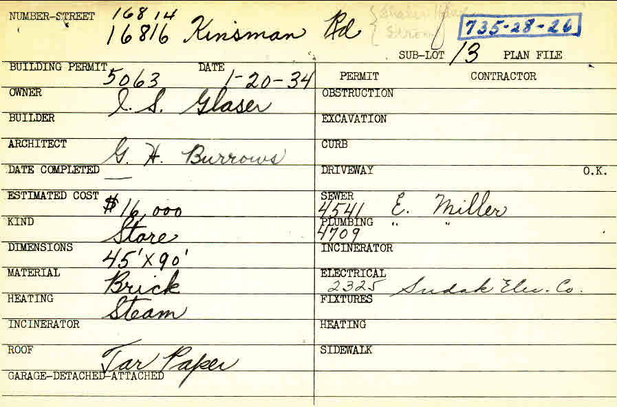 16814 Chagrin Boulevard Shaker Heights, OH 44120 PARCEL ID: 735-28-026 Building Permit Date: 01-20-1934 Plan File Number: 739 scanned, 5067, 6558, 93-57* Microfilm Roll: Roll010, Roll#69, Roll#86, NewRoll#16 Neighborhood: Lomond Owner: Glaser, J. S. Architect: Burrows, G. H. Estimated Cost: 16000 Kind: Commercial - Retail or Office Material: Brick Heating: Steam |