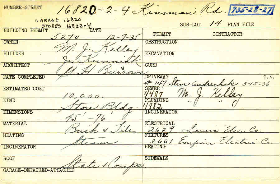16822 Chagrin Boulevard Shaker Heights, OH 44120 PARCEL ID: 735-28-027 Building Permit Date: 12-07-1935 Plan File Number: 20-07 scanned, 4264 scanned, 5893, 5921, 7776, 10403, 10490, 11104 Microfilm Roll: Roll020, Roll062, Roll#79, Roll#80, Roll#94, NewRoll#4, NewRoll#7 Neighborhood: Lomond Owner: Kelley, M. J. Builder: Kunnick, J. Architect: Burrows, G. H. Estimated Cost: 10000 Kind: Commercial - Retail or Office Material: Brick and Tile Heating: Steam Roof: Slate |