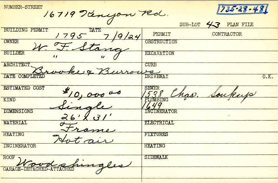16719 Kenyon Road Shaker Heights, OH 44120 PARCEL ID: 735-28-048 Building Permit Date: 07-09-1924 Plan File Number: 0 Neighborhood: Lomond Owner: Stang, W. F. Builder: Stang, W. F. Architect: Brooke and Burrows Estimated Cost: 10000 Kind: Single, Single Residence or Dwelling Material: Frame Heating: Hot Air Roof: Wood Shingle Card Available: yes |