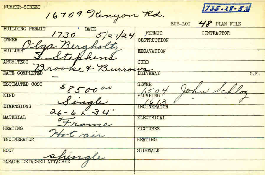 16709 Kenyon Road Shaker Heights, OH 44120 PARCEL ID: 735-28-053 Building Permit Date: 05-27-1924 Plan File Number: 0 Neighborhood: Lomond Owner: Bergholtz, Olga Builder: Stephens, S. Architect: Brooke and Burrows Estimated Cost: 8500 Kind: Single, Single Residence or Dwelling Material: Frame Heating: Hot Air Roof: Shingles Card Available: yes |