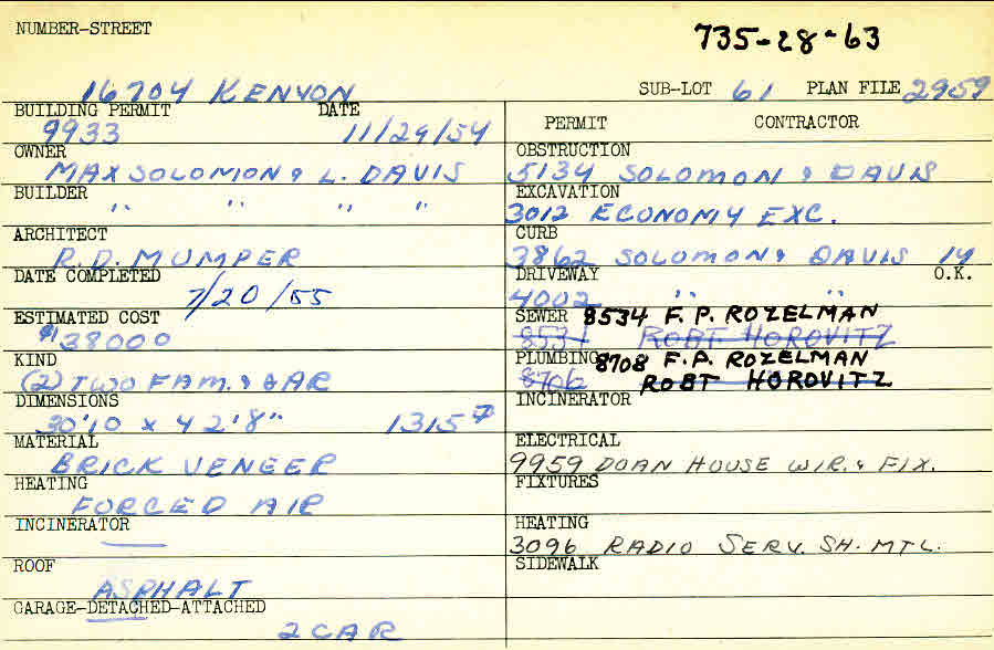 16704 Kenyon Road Shaker Heights, OH 44120 PARCEL ID: 735-28-063 Building Permit Date: 11-29-1954 Plan File Number: 2959 Microfilm Roll: Roll#42 Neighborhood: Lomond Owner: Solomon, Max and Davis, L. Builder: Solomon, Max and Davis, L. Architect: Mumper, Richard D. Estimated Cost: 38000 Date Completed: 07-20-1955 Kind: Duplex or Two-Family and Garage Material: Brick Veneer Heating: Forced Air Roof: Asphalt Garage: detached 2 car |