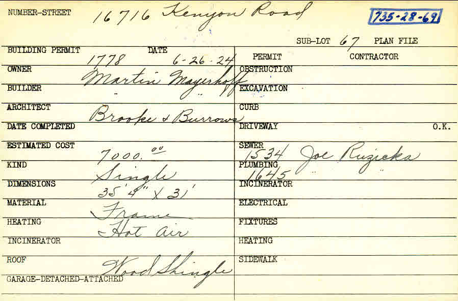 16716 Kenyon Road Shaker Heights, OH 44120 PARCEL ID: 735-28-069 Building Permit Date: 06-26-1924 Plan File Number: 0 Neighborhood: Lomond Owner: Mayerhoff, Martin Builder: Mayerhoff, Martin Architect: Brooke and Burrows Estimated Cost: 7000 Kind: Single, Single Residence or Dwelling Material: Frame Heating: Hot Air Roof: Wood Shingle Card Available: yes |