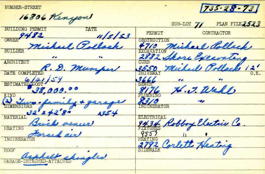 16806 Kenyon Road Shaker Heights, OH 44120 PARCEL ID: 735-28-073 Building Permit Date: 11-05-1953 Plan File Number: 2523 Microfilm Roll: Roll #36 Neighborhood: Lomond Owner: Pollack, Michael Builder: Pollack, Michael Architect: Mumper, R. D. Estimated Cost: 38000 Date Completed: 06-21-1954 Kind: Duplex or Two-Family and Garage Material: Brick Veneer Heating: Forced Air Roof: Asphalt Shingles Garage: detached |