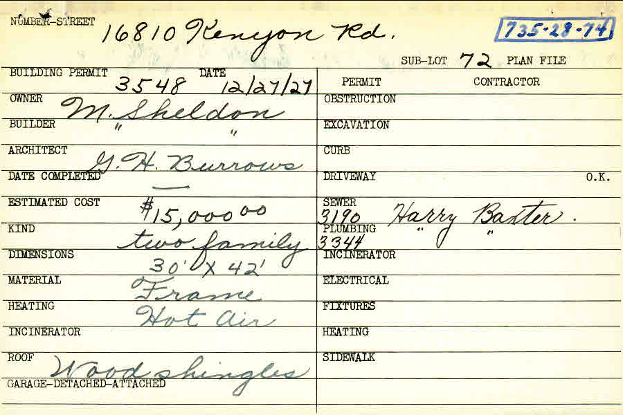 16810 Kenyon Road Shaker Heights, OH 44120 PARCEL ID: 735-28-074 Building Permit Date: 12-27-1927 Plan File Number: 6377, 6402, 7245 Microfilm Roll: Roll#85, Roll#92 Neighborhood: Lomond Owner: Sheldon, M. Builder: Sheldon, M. Architect: Burrows, G. H. Estimated Cost: 15000 Kind: Duplex or Two-Family Material: Frame Heating: Hot Air Roof: Wood Shingle |