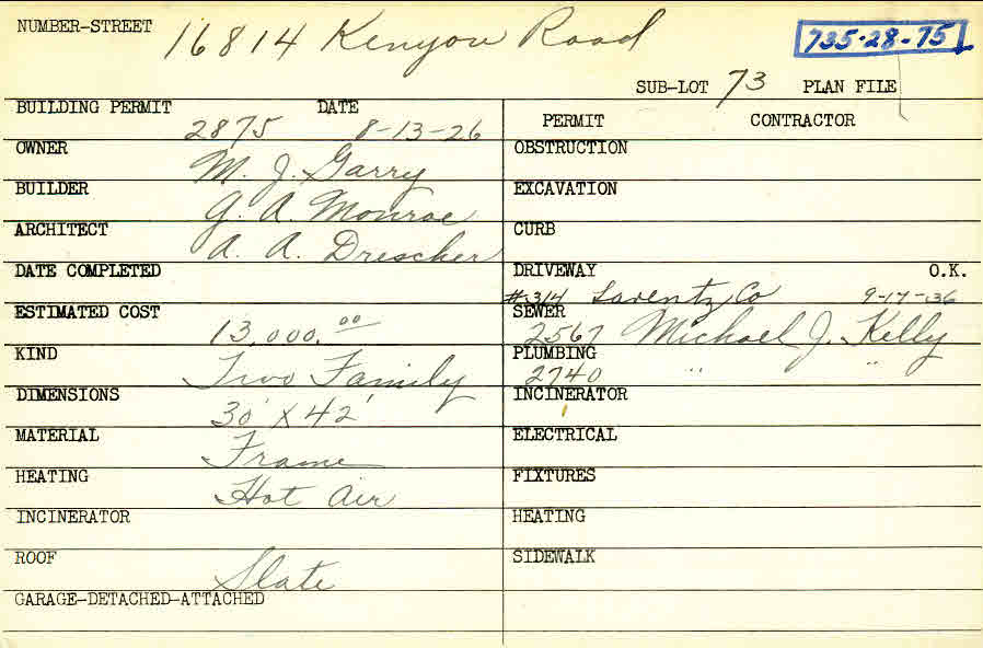 16814 Kenyon Road Shaker Heights, OH 44120 PARCEL ID: 735-28-075 Building Permit Date: 08-13-1926 Plan File Number: 1379 scanned, 5583, 10635 Microfilm Roll: Roll016, Roll#76, NewRoll#5 Neighborhood: Lomond Owner: Garry, M. J. Builder: Monroe, G. A. Architect: Drescher, A. A. Estimated Cost: 13000 Kind: Duplex or Two-Family Material: Frame Heating: Hot Air Roof: Slate |