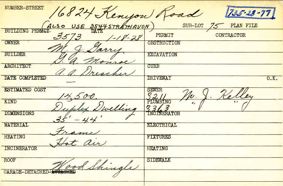 16824 Kenyon Road Shaker Heights, OH 44120 PARCEL ID: 735-28-077 Building Permit Date: 01-18-1928 Plan File Number: 0 Neighborhood: Lomond Owner: Garry, M. J. Builder: Monroe, G. A. Architect: Drescher, A. A. Estimated Cost: 14500 Kind: Duplex or Two-Family Material: Frame Heating: Hot Air Roof: Wood Shingle Garage: detached Card Available: yes |