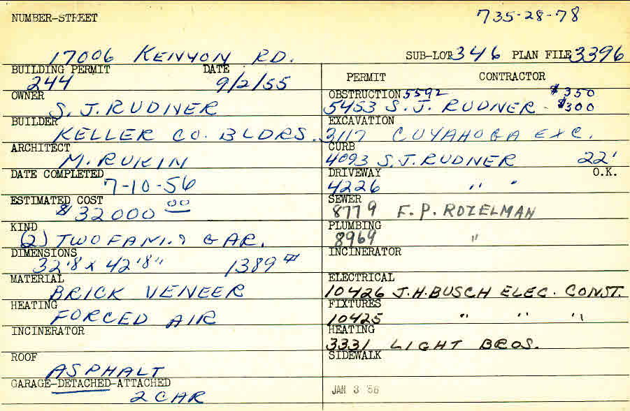 17006 Kenyon Road Shaker Heights, OH 44120 PARCEL ID: 735-28-078 Building Permit Date: 09-02-1955 Plan File Number: 3396 Microfilm Roll: Roll#49 Neighborhood: Lomond Owner: Rudner, S. J. Builder: Keller Company Builders Architect: Rukin, M. Estimated Cost: 32000 Date Completed: 07-10-1956 Kind: Duplex or Two-Family and Garage Material: Brick Veneer Heating: Forced Air Roof: Asphalt Garage: detached 2 car |
