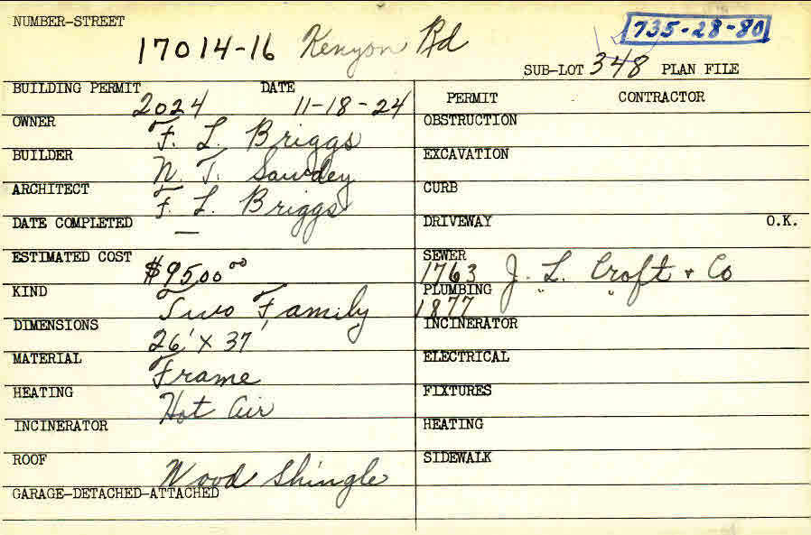 17014 Kenyon Road Shaker Heights, OH 44120 PARCEL ID: 735-28-080 Building Permit Date: 11-18-1924 Plan File Number: 6577 Microfilm Roll: Roll#86 Neighborhood: Lomond Owner: Briggs, F. L. Builder: Sawdey, N. T. Architect: Briggs, F. L. Estimated Cost: 9500 Kind: Duplex or Two-Family Material: Frame Heating: Hot Air Roof: Wood Shingle |