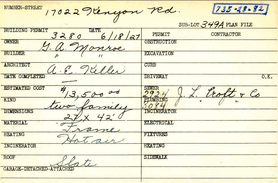 17022 Kenyon Road Shaker Heights, OH 44120 PARCEL ID: 735-28-082 Building Permit Date: 06-18-1927 Plan File Number: 0 Neighborhood: Lomond Owner: Monroe, G. A. Builder: Monroe, G. A. Architect: Keller, Arthur Emil Estimated Cost: 13500 Kind: Duplex or Two-Family Material: Frame Heating: Hot Air Roof: Slate |