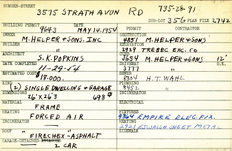 3575 Strathavon Road Shaker Heights, OH 44120 PARCEL ID: 735-28-091 Building Permit Date: 05-14-1954 Plan File Number: 2742 Microfilm Roll: Roll #38 Neighborhood: Lomond Owner: M. Helper and Sons, Inc. Builder: M. Helper and Sons, Inc. Architect: Popkins, S. K. Estimated Cost: 18000 Date Completed: 11-29-1954 Kind: Single Dwelling and Garage (2) Material: Frame Heating: Forced Air Roof: Asphalt Garage: detached 2 car |