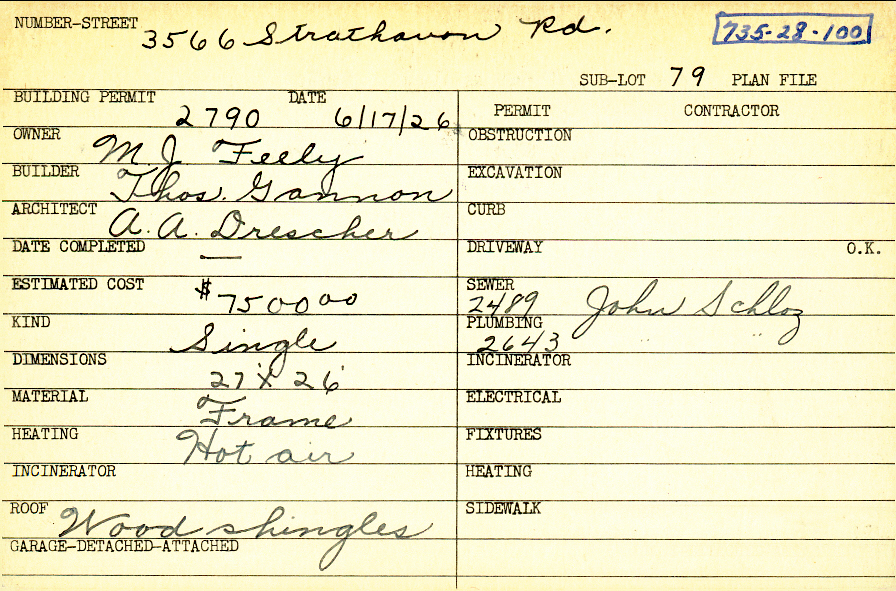 3566 Strathavon Road Shaker Heights, OH 44120 PARCEL ID: 735-28-100 Building Permit Date: 06-17-1926 Plan File Number: 5912 Microfilm Roll: Roll#80 Neighborhood: Lomond Owner: Feely, M. J. Builder: Gannon, Thomas Architect: Drescher, A. A. Estimated Cost: 7500 Kind: Single, Single Residence or Dwelling Material: Frame Heating: Hot Air Roof: Wood Shingle |