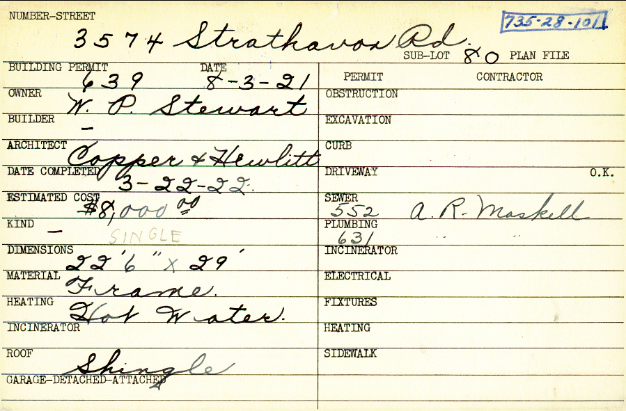 3574 Strathavon Road Shaker Heights, OH 44120 PARCEL ID: 735-28-101 Building Permit Date: 08-03-1921 Plan File Number: 0 Neighborhood: Lomond Owner: Stewart, W. P. Builder: Stewart, W. P. Architect: Copper and Hewlitt Estimated Cost: 8000 Date Completed: 03-22-1922 Kind: Single, Single Residence or Dwelling Material: Frame Heating: Hot Water Roof: Shingles Card Available: yes |