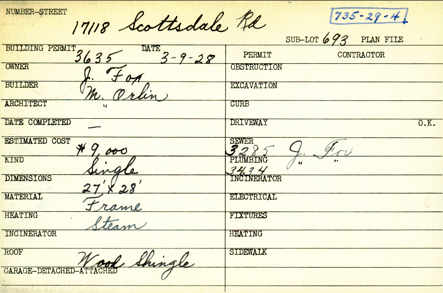 17118 Scottsdale Boulevard Shaker Heights, OH 44120 PARCEL ID: 735-29-004 Building Permit Date: 03-09-1928 Plan File Number: 0 Neighborhood: Lomond Owner: Fox, J. Builder: Orlin, M. Architect: Orlin, M. Estimated Cost: 9000 Kind: Single, Single Residence or Dwelling Material: Frame Heating: Steam Roof: Wood Shingle Card Available: yes |
