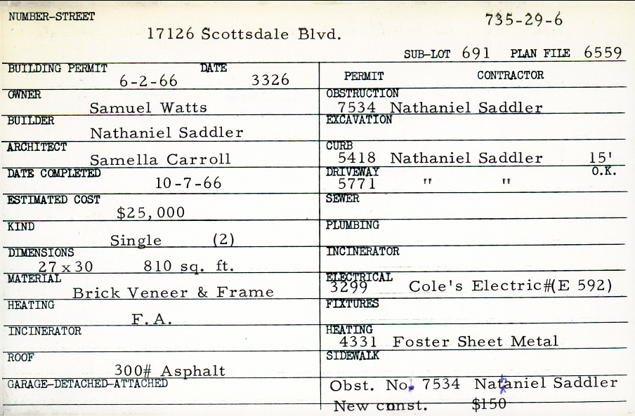 17126 Scottsdale Boulevard Shaker Heights, OH 44120 PARCEL ID: 735-29-006 Building Permit Date: 06-02-1966 Plan File Number: 6559 Microfilm Roll: Roll#86 Neighborhood: Lomond Owner: Watts, Samuel Builder: Saddler, Nathaniel Architect: Carroll, Samella Estimated Cost: 25000 Date Completed: 10-07-1966 Kind: Single, Single Residence or Dwelling (2) Material: Brick Veneer and Frame Heating: Forced Air Roof: 300# Min Asphalt |