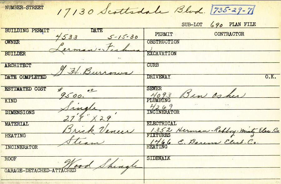 17130 Scottsdale Boulevard Shaker Heights, OH 44120 PARCEL ID: 735-29-007 Building Permit Date: 05-15-1930 Plan File Number: 7700, 7780 Microfilm Roll: Roll#94 Neighborhood: Lomond Owner: Fishman, Lerman Builder: Fishman, Lerman Architect: Burrows, G. H. Estimated Cost: 9500 Kind: Single, Single Residence or Dwelling Material: Brick Veneer Heating: Steam Roof: Wood Shingle |
