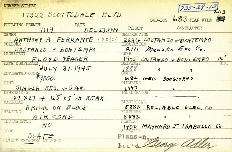 17322 Scottsdale Boulevard Shaker Heights, OH 44120 PARCEL ID: 735-29-013 Building Permit Date: 12-23-1944 Neighborhood: Lomond Owner: Ferrante, Anthony A. Builder: Costanzo and Bontempo Architect: Yeager, Floyd E. Estimated Cost: 9000 Date Completed: 07-31-1945 Kind: Single Dwelling and Garage Material: Brick on Block Heating: Air Conditioned Roof: Slate Garage: detached Blueprints: no blueprints on microfilm |