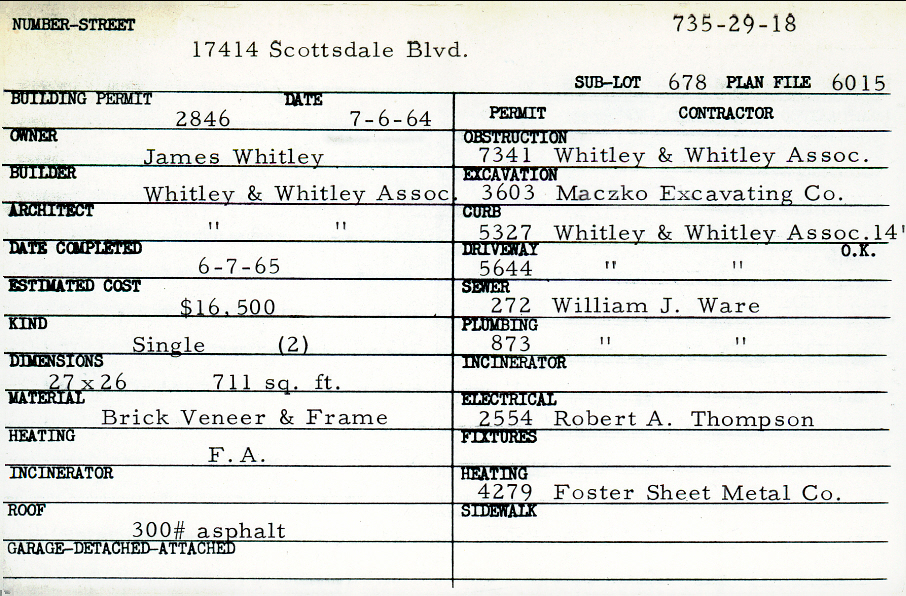 17414 Scottsdale Boulevard Shaker Heights, OH 44120 PARCEL ID: 735-29-018 Building Permit Date: 07-06-1964 Plan File Number: 6015 Microfilm Roll: Roll#80 Neighborhood: Lomond Owner: Whitley, James Builder: Whitley and Whitley Associates Architect: Whitley and Whitley Associates Estimated Cost: 16500 Date Completed: 06-07-1965 Kind: Single, Single Residence or Dwelling (2) Material: Brick Veneer and Frame Heating: Forced Air Roof: 300# Min Asphalt |