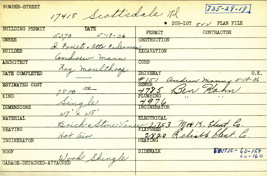 17418 Scottsdale Boulevard Shaker Heights, OH 44120 PARCEL ID: 735-29-019 Building Permit Date: 05-18-1936 Plan File Number: 6404 Microfilm Roll: Roll#85 Neighborhood: Lomond Owner: Foriet, J. and Federman, Otto Builder: Mann, Andrew Architect: Moulthrop, Ray Estimated Cost: 7800 Kind: Single, Single Residence or Dwelling Material: Brick and Stone Veneer Heating: Hot Air Roof: Wood Shingle |