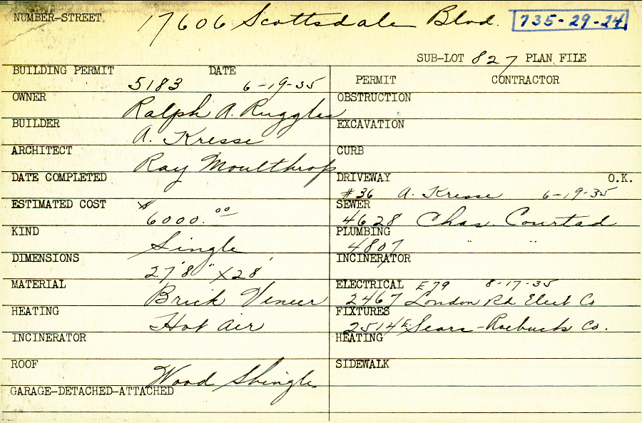 17606 Scottsdale Boulevard Shaker Heights, OH 44120 PARCEL ID: 735-29-024 Building Permit Date: 06-19-1935 Plan File Number: 7712 Microfilm Roll: Roll#94 Neighborhood: Lomond Owner: Ruggles, Ralph A. Builder: Kresse, A. Architect: Moulthrop, Ray Estimated Cost: 6000 Kind: Single, Single Residence or Dwelling Material: Brick Veneer Heating: Hot Air Roof: Wood Shingle |