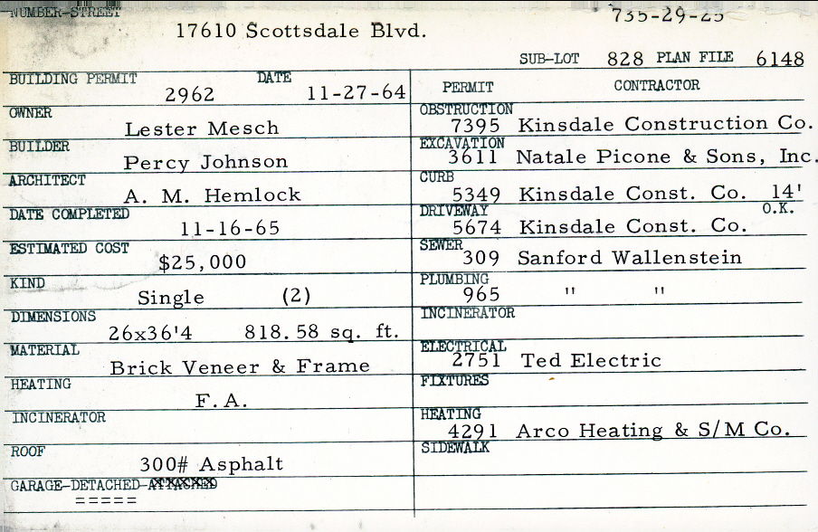 17610 Scottsdale Boulevard Shaker Heights, OH 44120 PARCEL ID: 735-29-025 Building Permit Date: 11-27-1964 Plan File Number: 6148 all scanned Microfilm Roll: Roll083 Neighborhood: Lomond Owner: Mesch, Lester Builder: Johnson, Percy Architect: Hemlock, A. M. Estimated Cost: 25000 Date Completed: 11-16-1965 Kind: Single, Single Residence or Dwelling (2) Material: Brick Veneer and Frame Heating: Forced Air Roof: 300# Min Asphalt Garage: detached |