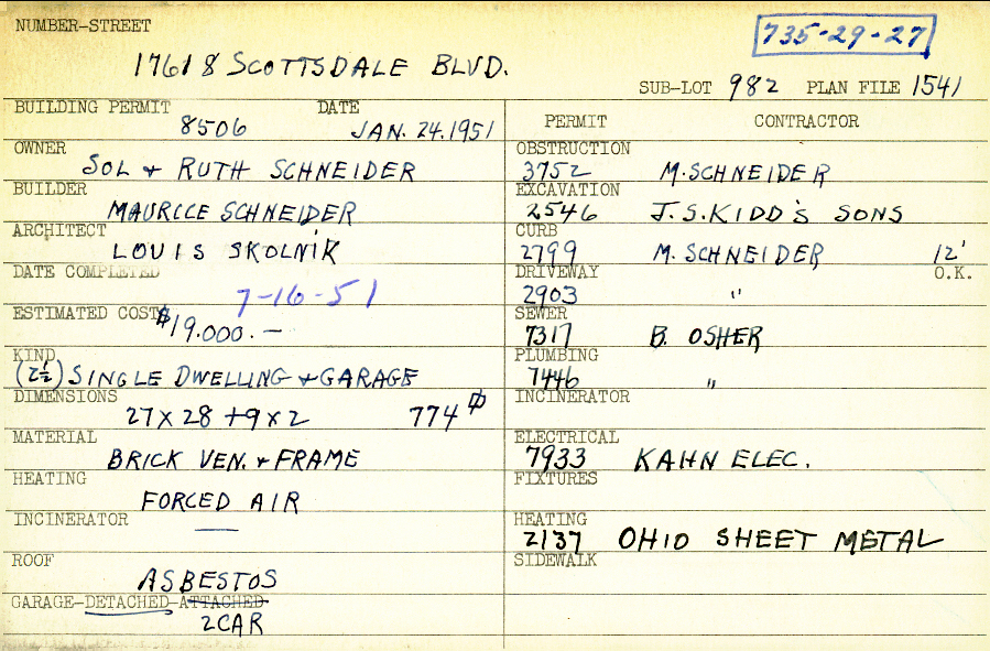 17618 Scottsdale Boulevard Shaker Heights, OH 44120 PARCEL ID: 735-29-027 Building Permit Date: 01-24-1951 Plan File Number: 1541 all scanned Microfilm Roll: Roll024 Neighborhood: Lomond Owner: Schneider, Sol and Ruth Builder: Schneider, Maurice Architect: Skolnik, Louis Estimated Cost: 19000 Date Completed: 07-16-1951 Kind: Single 2-1/2 Material: Brick Veneer and Frame Heating: Forced Air Roof: Asbestos Garage: detached 2 car |