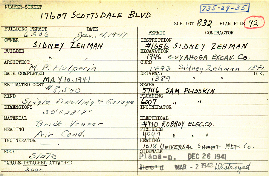 17607 Scottsdale Boulevard Shaker Heights, OH 44120 PARCEL ID: 735-29-035 Building Permit Date: 01-04-1941 Plan File Number: 92, 7569 Microfilm Roll: Roll#93 Neighborhood: Lomond Owner: Zehman, Sidney Builder: Zehman, Sidney Architect: Halperin, M. P. Estimated Cost: 8500 Date Completed: 05-10-1941 Kind: Single Dwelling and Garage Material: Brick Veneer Heating: Air Conditioned Roof: Slate Garage: detached 2 car |