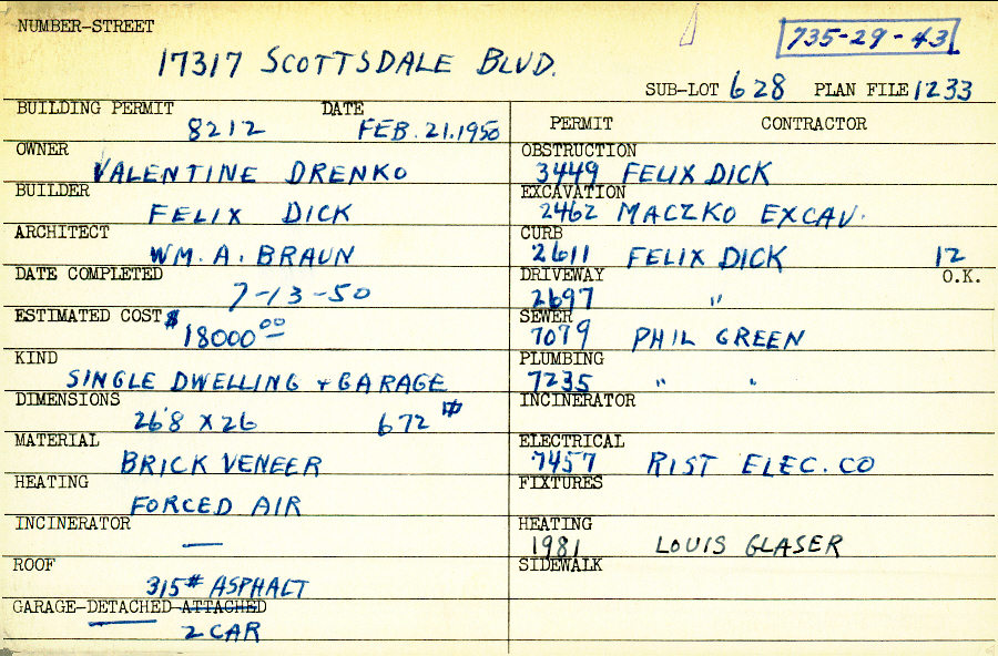 17317 Scottsdale Boulevard Shaker Heights, OH 44120 PARCEL ID: 735-29-043 Building Permit Date: 02-21-1950 Plan File Number: 1233 all scanned Microfilm Roll: Roll014 Neighborhood: Lomond Owner: Drenko, Valentine Builder: Dick, Felix Architect: Braun, William A. Estimated Cost: 18000 Date Completed: 07-13-1950 Kind: Single Dwelling and Garage Material: Brick Veneer Heating: Forced Air Roof: Asphalt Garage: detached 2 car |