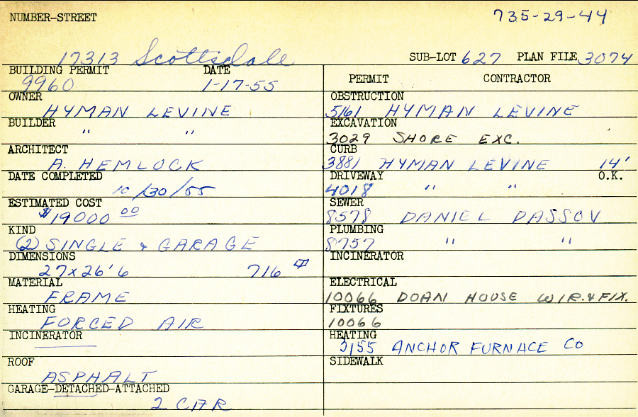 17313 Scottsdale Boulevard Shaker Heights, OH 44120 PARCEL ID: 735-29-044 Building Permit Date: 01-17-1955 Plan File Number: 3074 Microfilm Roll: Roll#43 Neighborhood: Lomond Owner: Levine, Hyman Builder: Levine, Hyman Architect: Hemlock, A. Estimated Cost: 19000 Date Completed: 10-30-1955 Kind: Single Dwelling and Garage (2) Material: Frame Heating: Forced Air Roof: Asphalt Garage: detached 2 car |
