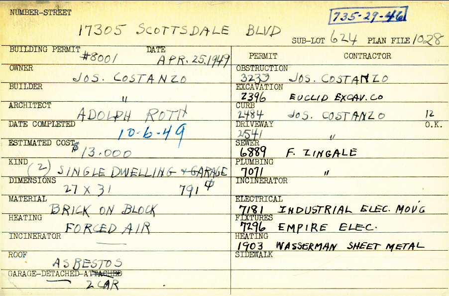 17305 Scottsdale Boulevard Shaker Heights, OH 44120 PARCEL ID: 735-29-046 Building Permit Date: 04-25-1949 Plan File Number: 1028 scanned, 12227 Microfilm Roll: Roll013, NewRoll#11 Neighborhood: Lomond Owner: Costanzo, Joseph Builder: Costanzo, Joseph Architect: Roth, Adolph Estimated Cost: 13000 Date Completed: 10-06-1949 Kind: Single Dwelling and Garage (2) Material: Brick on Block Heating: Forced Air Roof: Asbestos Garage: detached 2 car |
