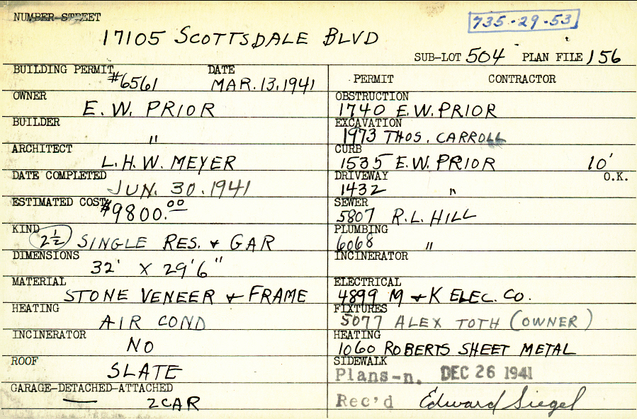17105 Scottsdale Boulevard Shaker Heights, OH 44120 PARCEL ID: 735-29-053 Building Permit Date: 03-13-1941 Plan File Number: 184, 450 all scanned Microfilm Roll: Roll002, Roll004 Neighborhood: Lomond Owner: Prior, E. W. Builder: Prior, E. W. Architect: Meyer, L. H. W. Estimated Cost: 9800 Date Completed: 06-30-1941 Kind: Single 2-1/2 Material: Stone Veneer and Frame Heating: Air Conditioned Roof: Slate Garage: detached 2 car |