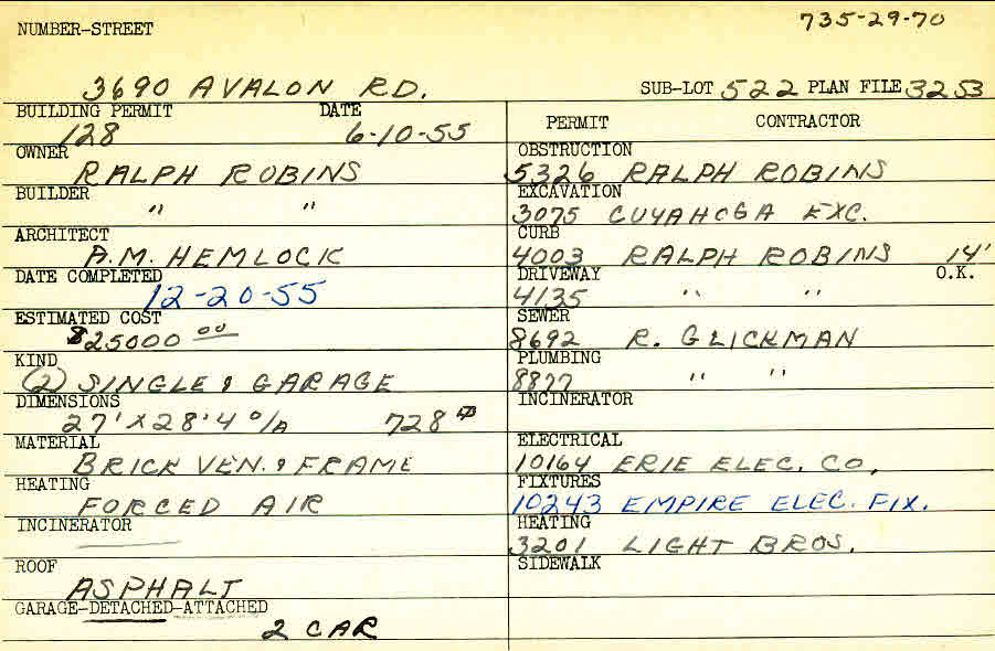 3690 Avalon Road Shaker Heights, OH 44120 PARCEL ID: 735-29-070 Building Permit Date: 06-10-1955 Plan File Number: 3253 Microfilm Roll: Roll#47 Neighborhood: Lomond Owner: Robins, Ralph Builder: Robins, Ralph Architect: Hemlock, A. M. Estimated Cost: 25000 Date Completed: 12-20-1955 Kind: Single Dwelling and Garage (2) Material: Brick Veneer and Frame Heating: Forced Air Roof: Asphalt Garage: detached 2 car |