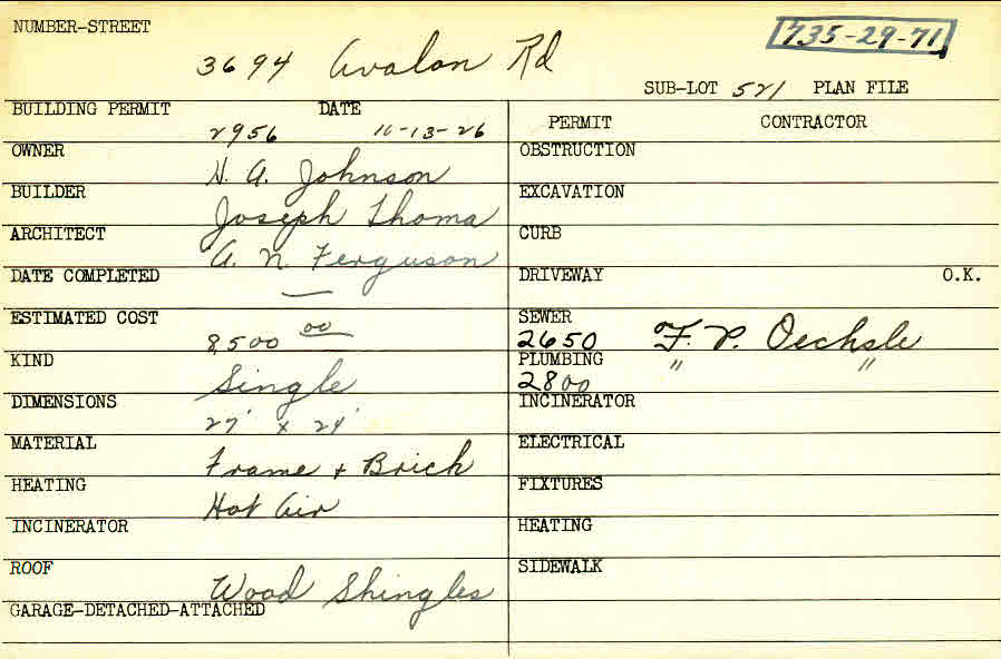 3694 Avalon Road Shaker Heights, OH 44120 PARCEL ID: 735-29-071 Building Permit Date: 11-13-1926 Plan File Number: 0 Neighborhood: Lomond Owner: Johnson, H. A. Builder: Thoma, Joseph Architect: Ferguson, A. N. Estimated Cost: 8500 Kind: Single, Single Residence or Dwelling Material: Frame and Brick Heating: Hot Air Roof: Wood Shingle Card Available: yes |