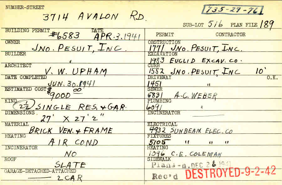 3714 Avalon Road Shaker Heights, OH 44120 PARCEL ID: 735-29-076 Building Permit Date: 04-03-1941 Plan File Number: 189, 5357 Microfilm Roll: Roll#73 Neighborhood: Lomond Owner: John Pesuit Inc. Builder: John Pesuit Inc. Architect: Upham, V. W. Estimated Cost: 9000 Date Completed: 06-30-1941 Kind: Single 2-1/2 Material: Brick Veneer and Frame Heating: Air Conditioned Roof: Slate Garage: detached 2 car |