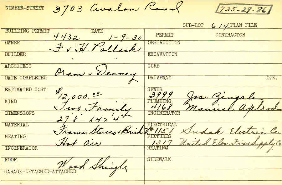 3703 Avalon Road Shaker Heights, OH 44120 PARCEL ID: 735-29-086 Building Permit Date: 01-09-1930 Plan File Number: 0 Neighborhood: Lomond Owner: F. and H. Pollack Builder: F. and H. Pollack Architect: Oram and Devney Estimated Cost: 12000 Kind: Duplex or Two-Family Material: Frame, Stucco and Brick Heating: Hot Air Roof: Wood Shingle Card Available: yes |